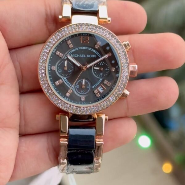 ₹19,999.00Original price was: ₹19,999.00.₹3,999.00Current price is: ₹3,999.00.This women’s chronograph watch from the Parker series of MICHAEL Michael Kors exudes elegance and sophistication. The black dial features three sub-dials, crystal hour markings, and three luminous hands, along with a date panel for added functionality. Encased in a sleek black stainless steel case with a crystal-embellished bezel, it is complemented by a black stainless steel three-link bracelet, secured with a deployant clasp. The timeless black design of this watch is sure to make a statement. The weight of this piece is 101 gms, the case thickness is 12 mm, and the inner circumference is 175+/- 5 mm.Add to cart -